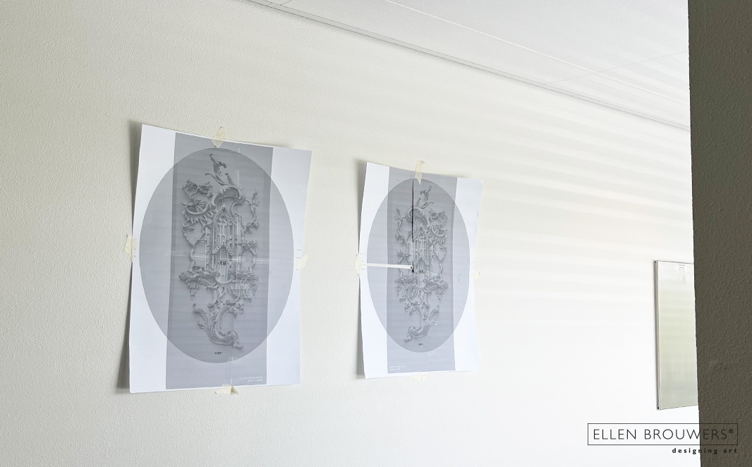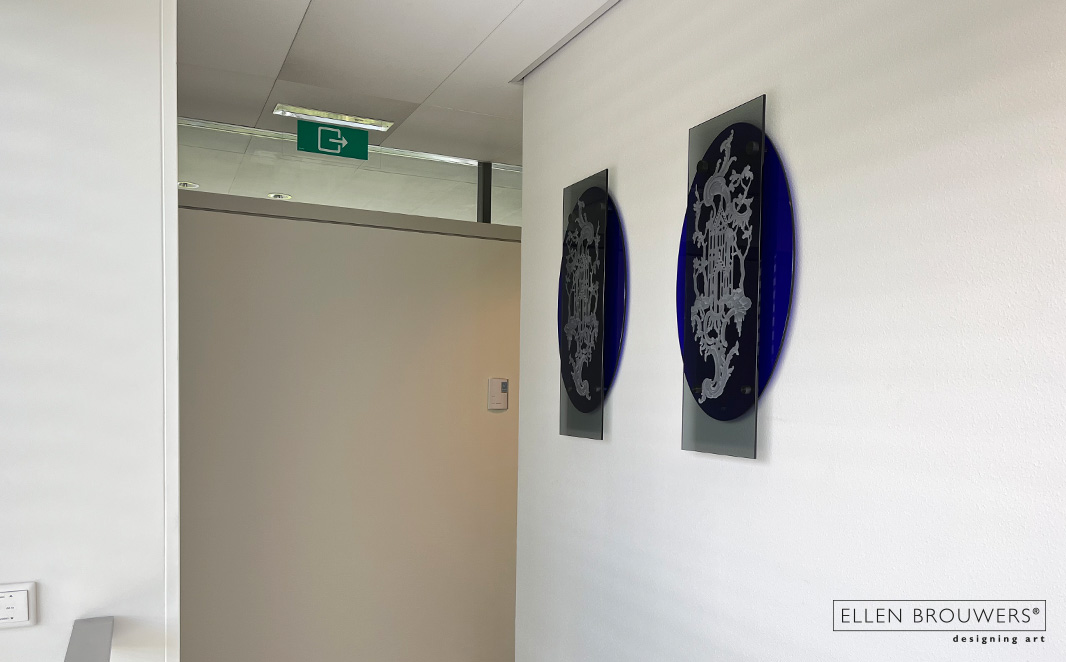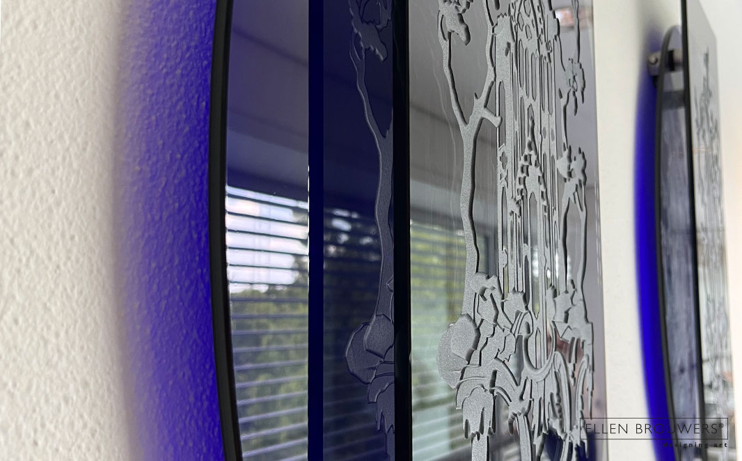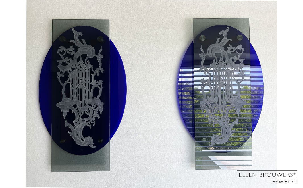 Glas kobaltblauw en grijs,  rvs ophangsysteem, diep straalwerk